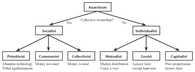 Left to right it goes from least propertarian to most propertarian. Anarcho-primitivism is not really an economic school, as primitive tribalism is its main thrust, but in economic theory it is identical to anarcho-communism. The main difference between the communist school (associated with Peter Kropotkin) and the collectivist school (founded by Michael Bakunin) is the position on money. The communists favor a "gift economy" without money; the collectivist may still use money, but in the form of labor notes rather than commodity receipts.
