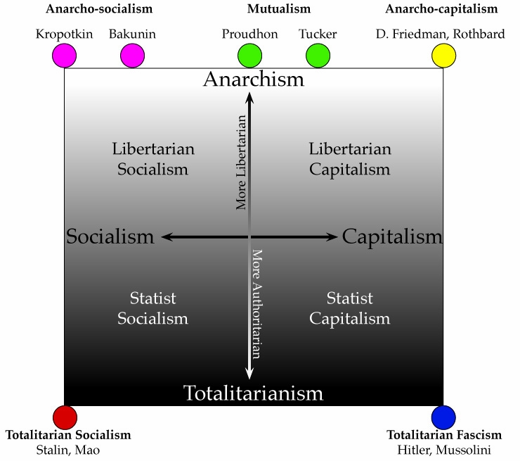 Anarcho-socialism is in the upper left and anarcho-capitalism the upper right. The vertical dimension represents the extent of government; the horizontal dimension represents legal fiction of property ownership - more precisely, the degree of propertarianism. Both "socialism" and "capitalism" have statist and anti-statist variants. The placement of persons and parties on this graph are approximate, and open to debate.